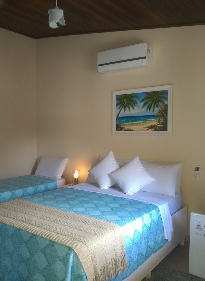 Quarto duplo aconchegante, ideal para casais ou amigos. Possui cama confortável, ar-condicionado, Wi-Fi, TV e banheiro privativo com chuveiro quente. Ambiente iluminado, decoração charmosa e limpeza impecável. Inclui roupa de cama e banho. Perfeito para relaxar e aproveitar a estadia com conforto e tranquilidade. Ofertamos serviço de limpeza dos quartos a partir da 3ª diária, com limpeza geral e troca da roupa de banho.