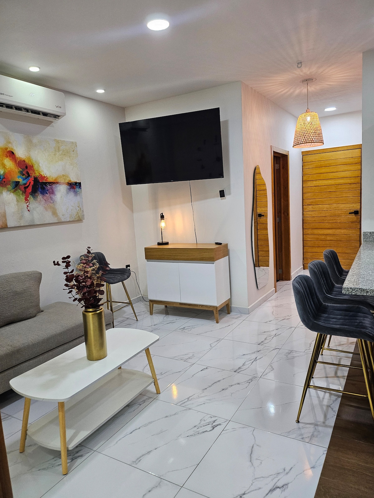 Hermoso y elegante Loft muy cerca del centro de Tlaquepaque donde encontrarás experiencias culinarias, culturales, amenidades y vida nocturna, a unos minutos caminando del tren que conecta toda la ciudad. El Loft cuenta con Aire acondicionado en habitación, área de cocina y sala, cuenta con ducha de lluvia de alta y media presión, cerradura digital, pantalla 4K, internet de alta velocidad 210 Mbps, y sensor CO2. No cuenta con cochera Disfruta de una hospedaje con estilo y elegancia