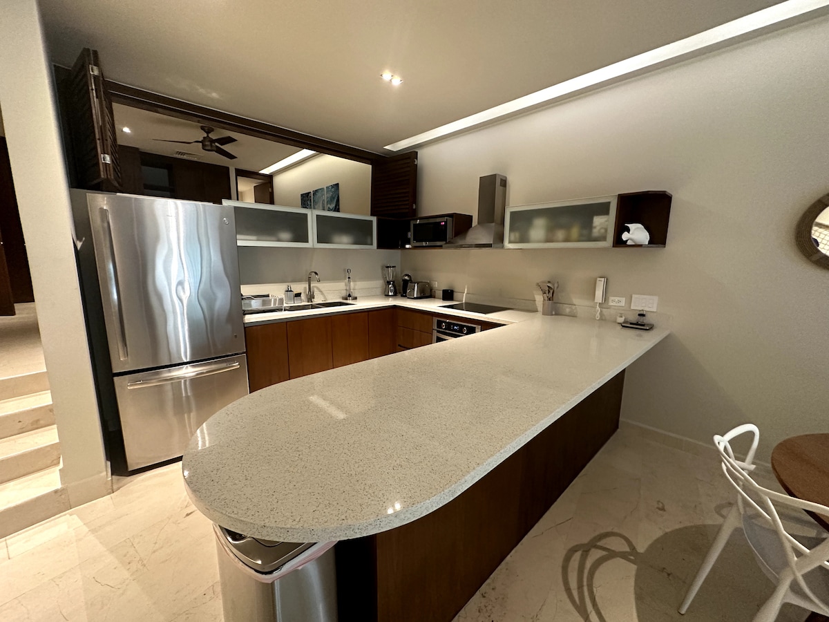 ¡Bienvenido a tu paraíso en Puerto Aventuras! Disfruta de un alojamiento de lujo con muebles de altísimo nivel, diseño moderno y elegante. Nuestras camas con colchones de alto confort, dos Smart TV de 65 pulgadas y un cómodo sofá te garantizan una estancia inigualable. Relájate en la terraza con jacuzzi, barbacoa y vistas al jardín, la alberca y el mar. Ubicado en planta baja, este acogedor apartamento de 2 recámaras ha sido remodelado para crear recuerdos inolvidables. ¡vive la experiencia!
