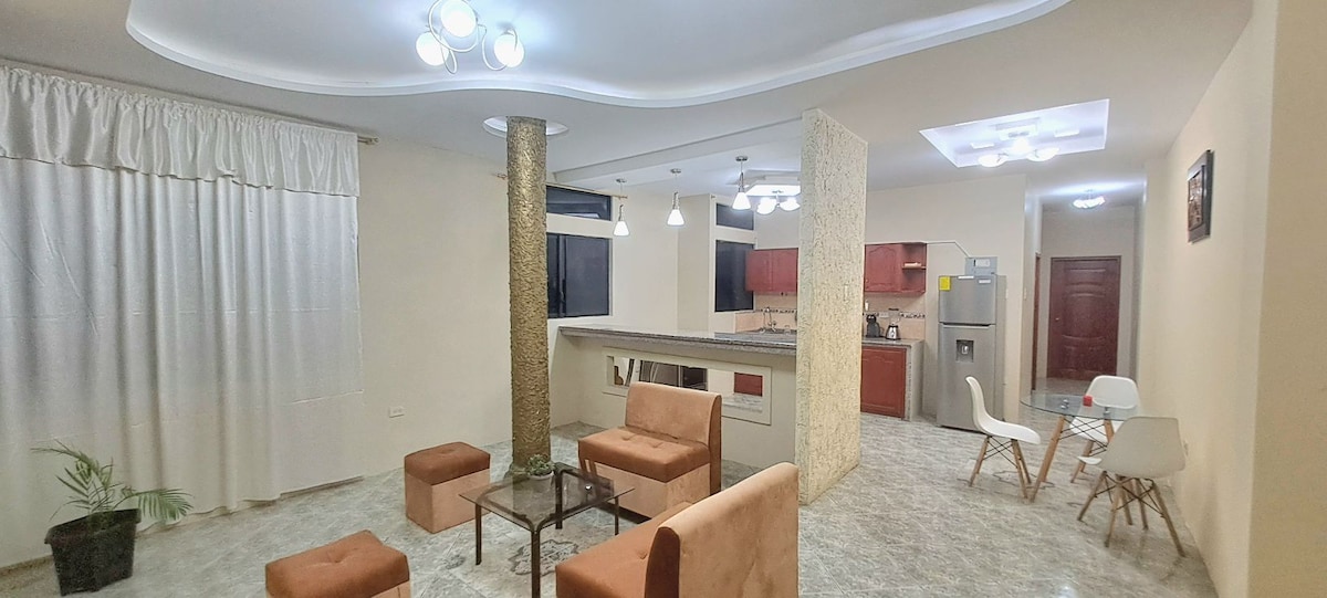 El departamento es de un solo ambiente (34m2 sin la terraza), con entrada independiente, cuyo acceso se hace por una escalera de exterior. Presenta una amplia terraza privada de madera, con linda vista al mar y hamaca. El baño es muy amplio, la kitchenette equipada con nevera (con congelador), cocina de 4 quemadores, olla arrocera, cafetera y tetera, todo lo que se necesita para su estadía. La conexión WiFi es de muy buena calidad, ideal para las personas que trabajan en línea. Muy seguro.