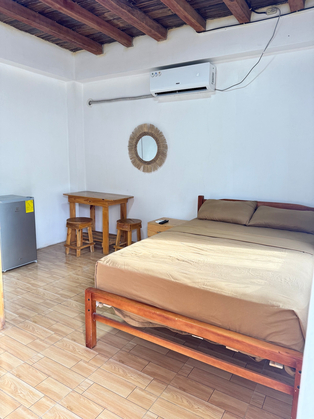 La suite combina elegancia, simplicidad y naturaleza, creando el ambiente perfecto para descansar, trabajar con tranquilidad o disfrutar de una escapada romántica en Olón. Al entrar, te recibe una sala luminosa con sofá amplio y detalles artesanales que crean una sensación de paz. La habitación principal cuenta con una cama King muy cómoda, iluminación cálida y un diseño natural en bambú que eleva la atmósfera de relajación.
