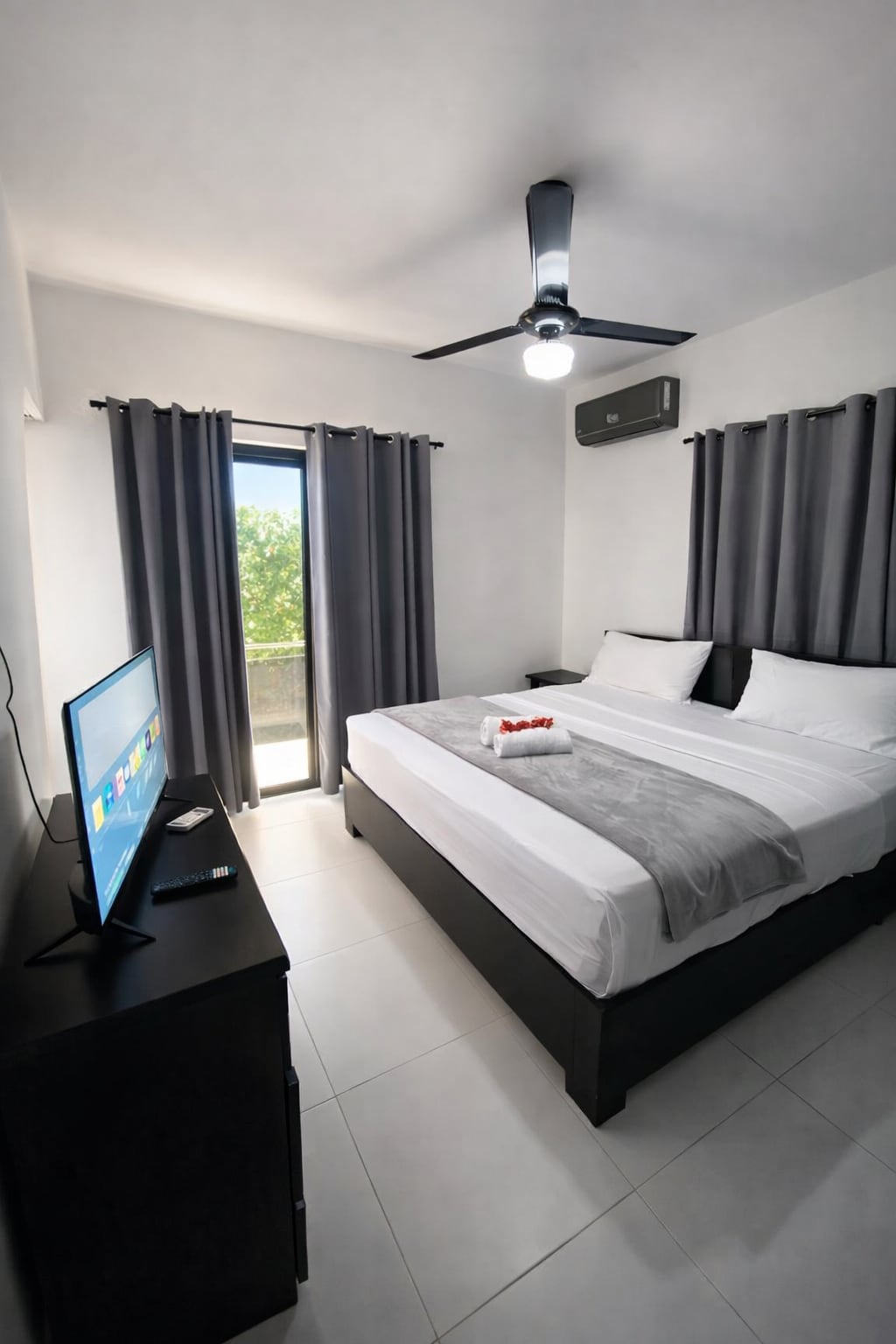 Céntrico y cómodo Apto. de 1 Hab. con Aire Acond., 2 Ventiladores de techo, cama King con tecnología Doble Pillow Top y 4 almohadas, WIFI banda ancha, TVs de 58" y 43" con Netflix, HBO Max & Disney Plus Gratis. Sofa cama y cuna opcional. Sala con cómodo mueble, ducha caliente y drenajes tecnología Anti-Insectos. Nevera ejecutiva con congelador, estufa de gas y extractor, microondas, cafetera, meseta y gabinetes. Moderna Caja fuerte, 2 detectores de humo y CO2 y extintor contra incendios.