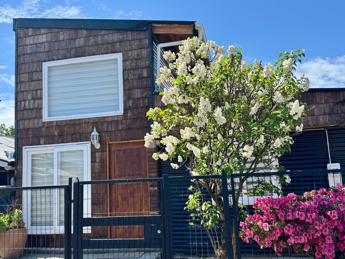 Acogedora Tiny house ideal para descansar en Puerto Varas. Con cama matrimonial, baño, cocina, TV y WiFi. Ubicada en villa Federico Errázuriz, a solo 5 min caminando de la playa de Puerto Chico. Cerca de micros a Puerto Montt y colectivos. Tambien cercano a restaurantes, centros de salud y Costanera. Perfecta para una escapada en pareja o para viajeros que buscan comodidad dentro de la misma ciudad sin gastar demás. Traslado Aeropuerto con costo adicional y Arriendo de bicicletas disponible