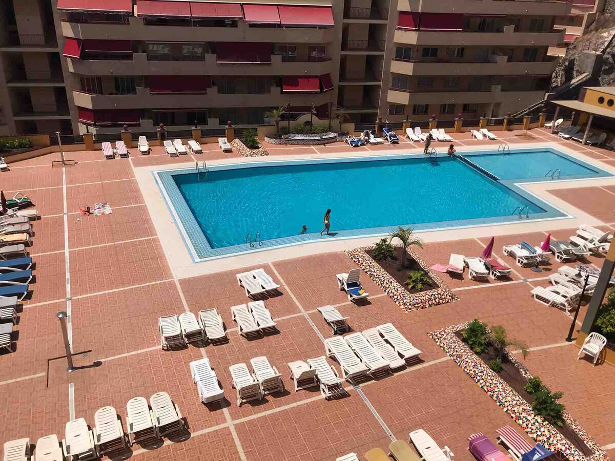 Apartamento Luminoso,Sol todo el día, NO AIRE CONDICIONADO, un dormitorio ,cama 180 cm y un sofá cama,un baño con lavadora (NO Detergente incluido),cocina con lo necesario,2 piscinas comunitarias una para niños , a pocos minutos de la playa y charcos naturales en los Gigantes y Alcalá con un paseo por la orilla del mar. A 30 min del aeropuerto S y 60 del aeropuerto N, cerca de los acantilados de los Gigantes y su playa de los Guios a 30 min caminando y supermercado a una calle del edificio