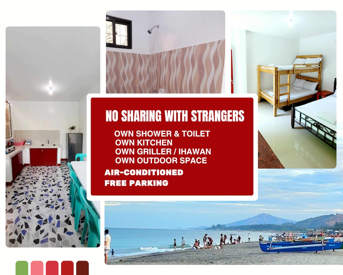 Esta sencilla casa privada en la playa está justo enfrente del Mar de Filipinas Occidental que ofrece espectaculares puestas de sol. En la parte trasera hay una piscina pequeña junto al río con vistas a las montañas donde sale el sol. Ideal para familias y grupos que desean su propio espacio mientras disfrutan de la naturaleza y ciertas comodidades básicas del hogar. Toda la propiedad privada frente a la playa para un máximo de 15 personas (P500 por persona adicional por noche); las 3 casas de campo con aire acondicionado; exclusivas.
