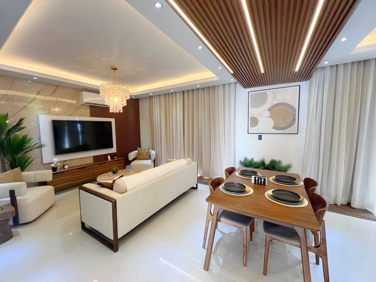 ✨ Moderno penthouse en Cap Cana con jacuzzi privado y ascensor. Ubicado a 5 min del aeropuerto y cerca de Playa Juanillo y Downtown Punta Cana. Ideal para 5 personas, ofrece terraza amplia, piscina, cocina equipada, WiFi rápido y estacionamiento privado. Zona tranquila y segura con supermercado cercano que ofrece delivery. Disfruta comodidad, privacidad y fácil acceso a restaurantes y servicios. ¡Reserva y vive una experiencia única! ✨