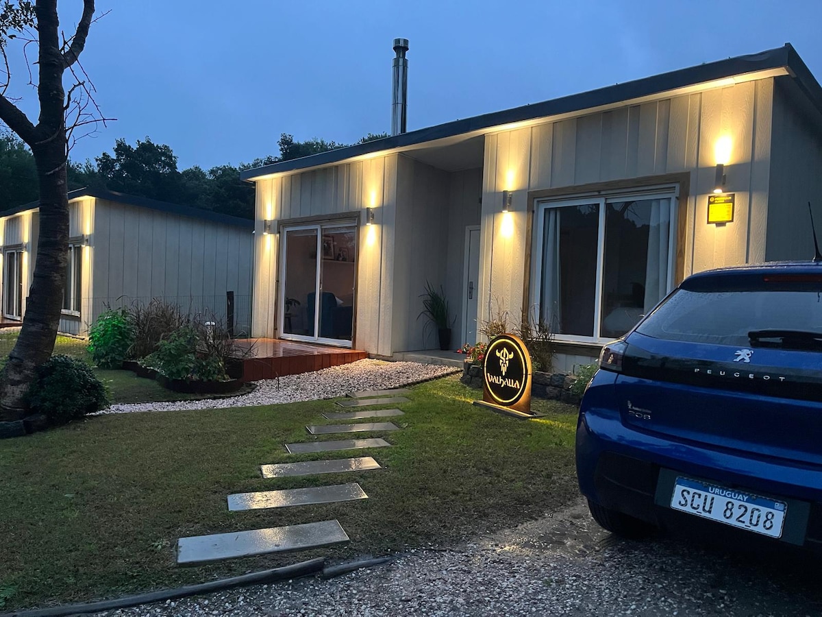 Acogedora cabaña estilo nórdico. Un nuevo concepto de vivienda especialmente diseñada para disfrutar en pareja. Está ubicada sobre la avenida Los Dorados y Benteveo, rodeada de naturaleza y con una hermosa vista al cerro del Toro. Cuenta con una hermosa galería con parrillero integrado a la casa bajo la sombra de unos pinos, y un espacioso jardín y estacionamiento. Una casa ideal para relajarse y disfrutar de un original estilo de vivienda, muy cerca de la playa, restaurantes y supermercado.