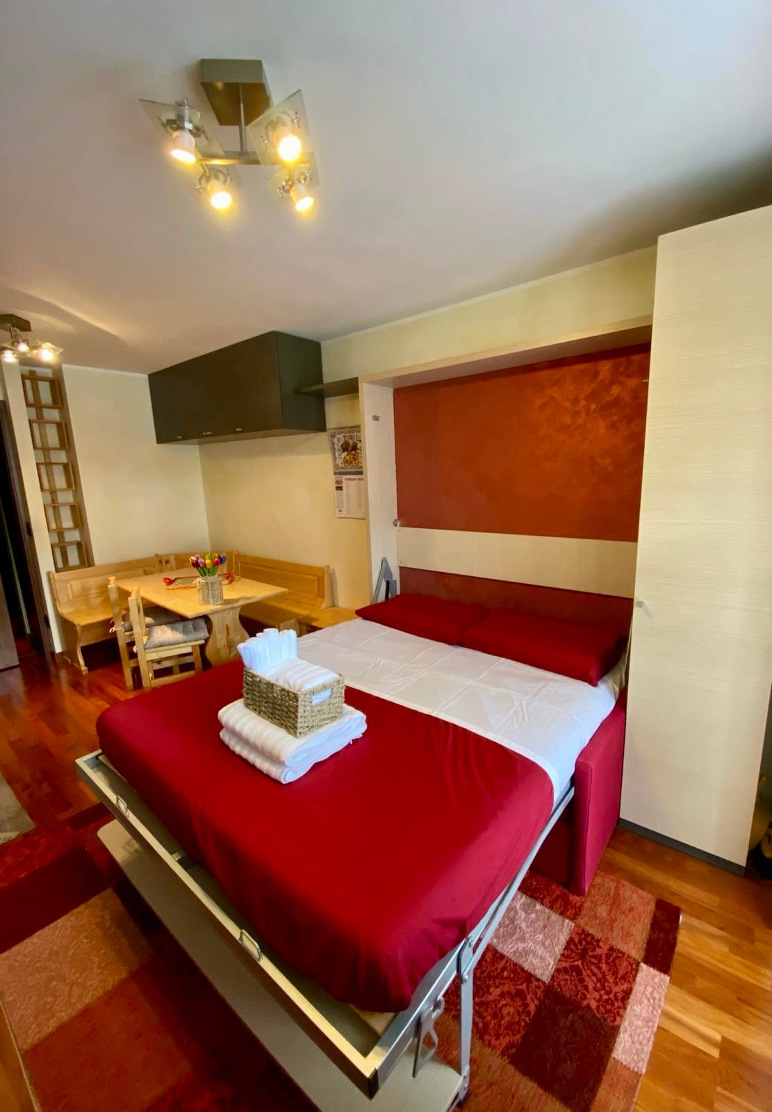L'alloggio è in pieno centro in un bel complesso con giardino condominiale, portineria,a 50 metri dalla fermata del bus gratuito che porta alle piste e alla stazione ferroviaria. E' uno spazioso bilocale con camera da letto ,ampio soggiorno con divano letto doppio e poltrona letto, cucina separata da ante scorrevoli, bagno con vasca doccia.Ha una splendida vista sulle montagne e un ampio terrazzo soleggiato. Ha un comodo posto auto in garage e una cantina che funge da ski box.