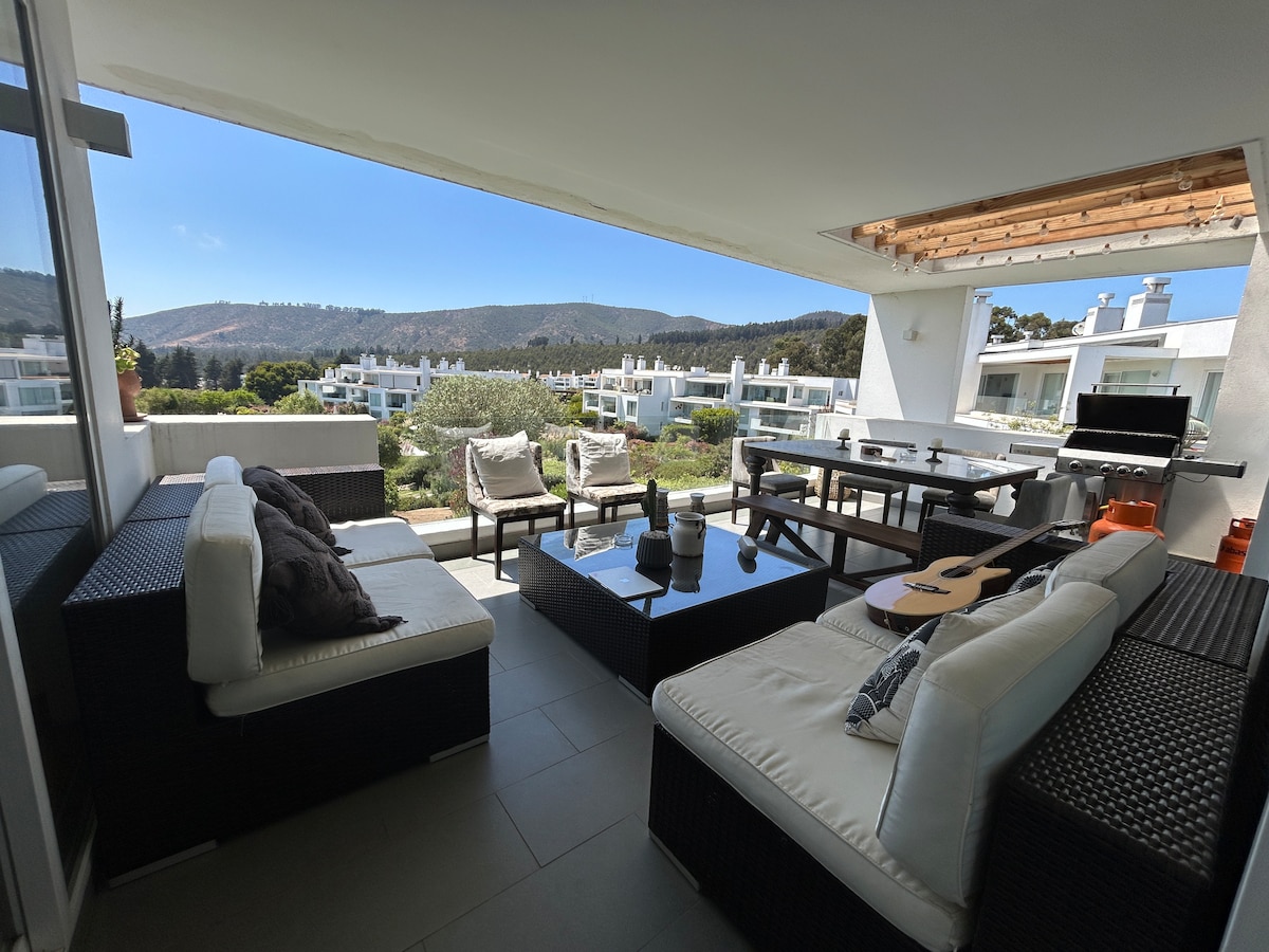 Estupendo depto. en primer piso, luminoso y con amplia TERRAZA y JARDIN PRIVADO. Capacidad 7 personas, amoblado, cocina completamente equipada, Smart TV con wifi y direct TV, lavadora y secadora, pack & play, libros, juegos de mesa y terraza con parrilla y estufa exterior Piscina, juegos infantiles y extensas áreas verdes, bus acercamiento a playa de Maitencillo Estacionamiento privado y de visitas, seguridad 24 hrs. Club de golf, Padel, Hotel, restaurantes, supermercados y aventura en parapente