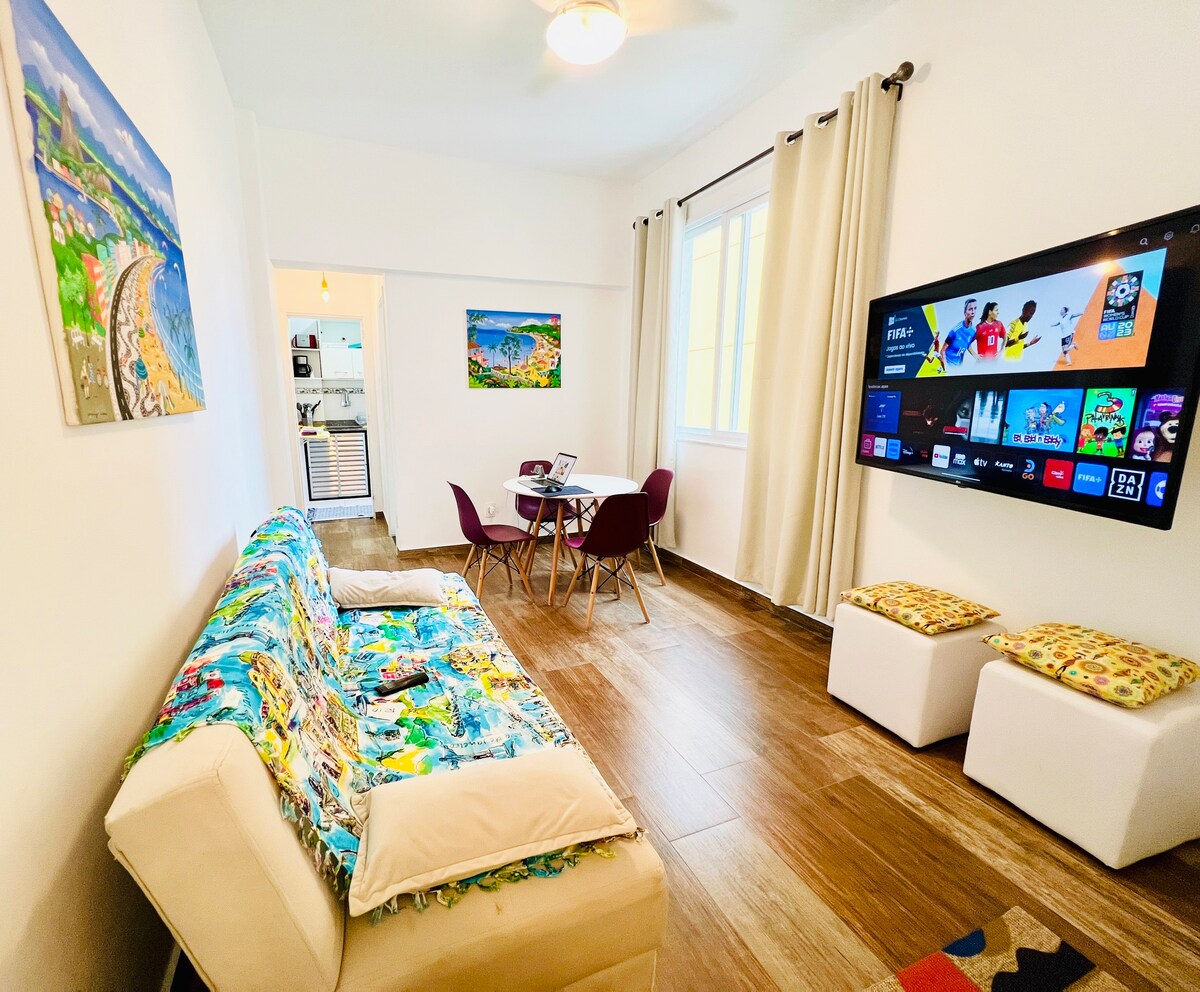 Amplio apartamento de un dormitorio a pocos pasos de la playa de Copacabana. Bellamente decorado con bonitos muebles modernos y cómodos. A poca distancia a pie de todo: restaurantes, bares, supermercados, tiendas. Amplio salón con sofá cama. Mesa con 4 sillas. Cocina totalmente equipada con estufa, horno, microondas y nevera de tamaño completo. Dormitorio con cama de matrimonio nueva con colchón de alta gama. Aire acondicionado en el dormitorio. Baño completo. Televisor inteligente de pantalla grande de 55 pulgadas, internet de alta velocidad de 250 megas. Seguridad las 24 horas.