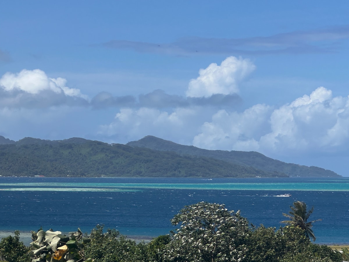 chambre avec grande salle de bain privative . deck et piscine ovoide 8M X4 devant la chambre . Vue imprenable sur Tahaa et le lagon . situé à un peu plus d'1km de la ville dans lotissement résidentiel, en hauteur à 70m d'altitude . dans la mesure de mes possibilités (90%) je viens vous chercher a l'aeroport gratuitement et je vous raccompagne a la fin de votre séjour ! un petit déjeuner tres copieux vous sera servi en terrasse , a l'heure qu'il conviendra . Pas de frais de nettoyage .