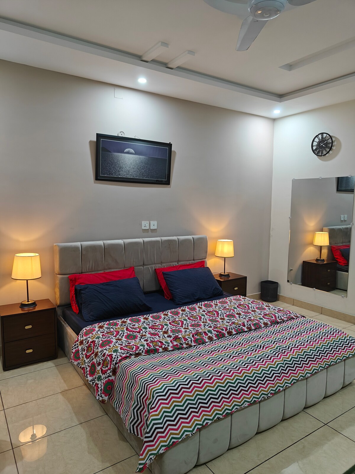 Welcome to your stylish and comfortable retreat at a 12 mins drive from Islamabad International Airport! This elegant 1-bedroom apartment is designed for business travelers and luxury-seeking guests, offering a blend of comfort, convenience, and sophistication. Apartment Highlights: Elegant Living Space – Contemporary furniture, sleek dining area, and a cozy lounge for unwinding after a long day. Fast Wi-Fi & Smart TV – Stay connected and entertained with high-speed internet and a smart TV.