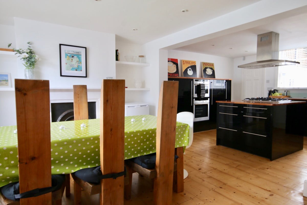 Make wonderful family memories in our beautiful & spacious townhouse sleeping up to 10 people in 5 bedrooms, 2 bath, 1 WC. Enjoy family meals in the kitchen, cosy relaxing rooms and take a short walk to the beach or Royal Harbour. Located in the heart of Ramsgate's Conservation Area. Fabulous restaurants & cafes a moments walk away. Eclectic shopping on your doorstep. Perfect for families or friends holidaying or a colleagues working. We welcome children & pets. 🪴Enclosed Garden
