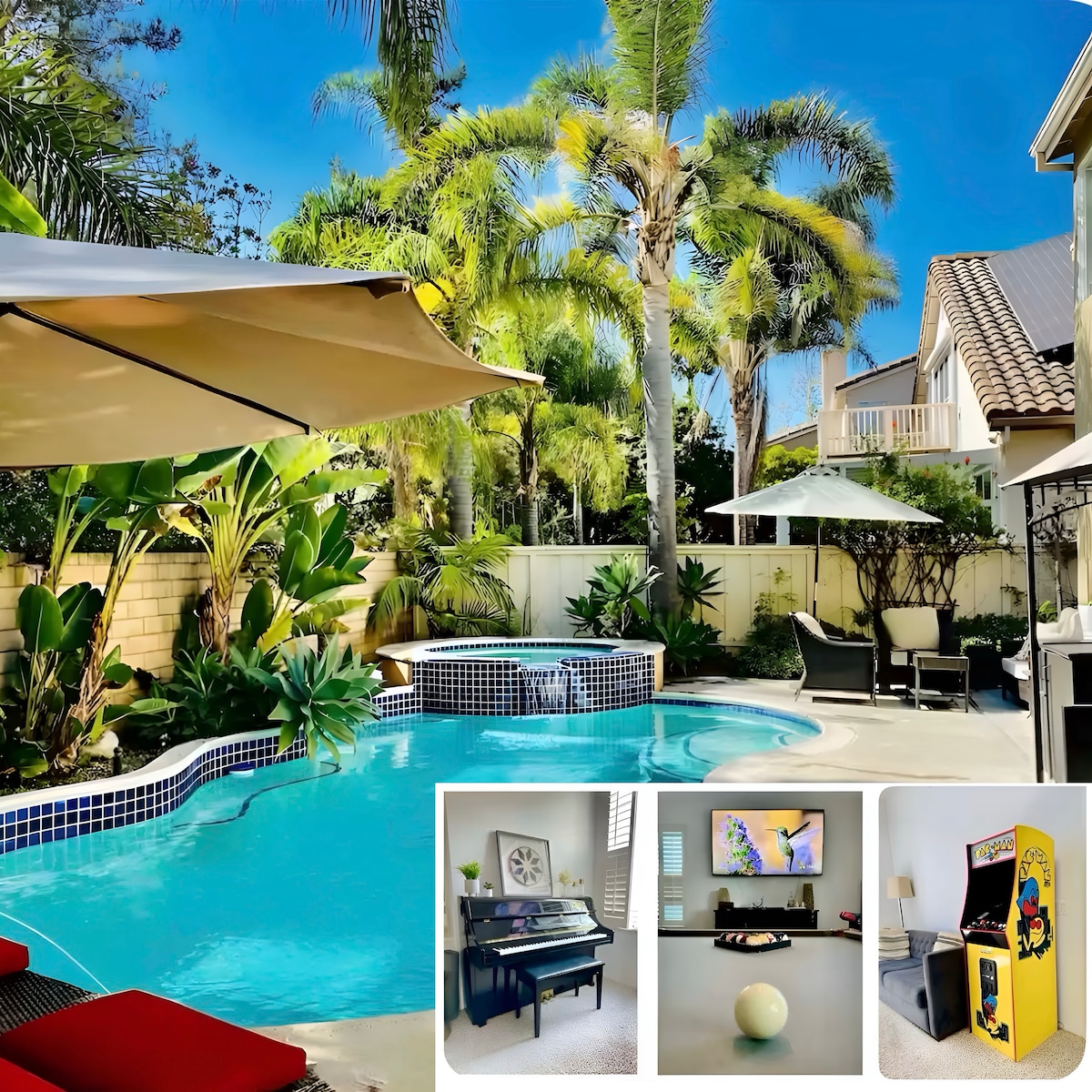 LEGOLAND y las mejores PLAYAS cercanas. Piscina, spa, cancha de tenis, pickleball, baloncesto, sala de juegos, ping pong, pesca, piragüismo en un estanque de 1/2 acre con peces, patos y aves, barbacoa, chimenea, todo para tu uso privado EXCLUSIVO. PARAÍSO TROPICAL único y cómodo para RELAJARSE y DIVERTIRSE en el condado norteño de SAN DIEGO. Muchas atracciones, cervecerías ARTESANALES y cocina. ***Hay 3 residencias privadas en la propiedad de 2,5 acres. Tu residencia es tu propia casa, todo es para tu uso privado.