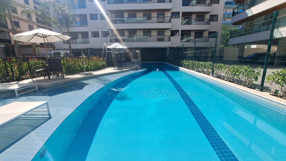 Disfruta de este apartamento completamente renovado para cuatro personas en la mejor ubicación de Cabo Frio: en el límite de Praia do Forte, esquina de Av. Nilo Peçanha. [Haz clic en Más información para ver el anuncio completo] Cuenta con 2 dormitorios (uno de los cuales es una suite), cocina totalmente equipada, comedor y sala de estar con TV, ¡todo nuevo y con aire acondicionado para tu comodidad!