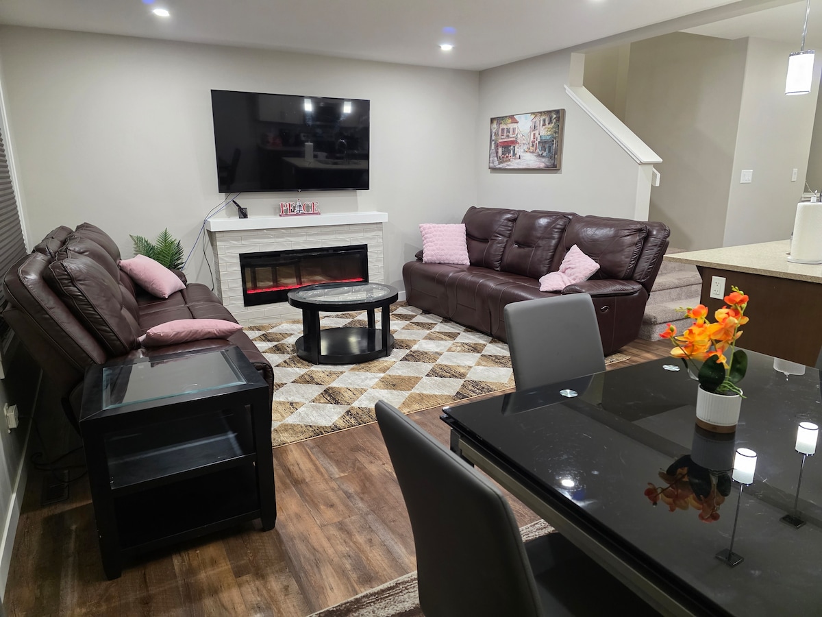 Spacious and stylish family-friendly house accommodating up to 6 people The house is located in the Towns community in East Regina (Greens). Exceptionally convenient location, bus stops a few steps away, 3 mins to Regina Bypass ring road, 15 mins to the University of Regina, 5 mins to Costco, Superstore, The Canadian Brewhouse, great amenities 3 bedrooms with one King size bed, and 2 Queen beds and 2.5bathrooms. 2 power recliner sofas, WIFI &free garage parking spot and 1 driveway parking