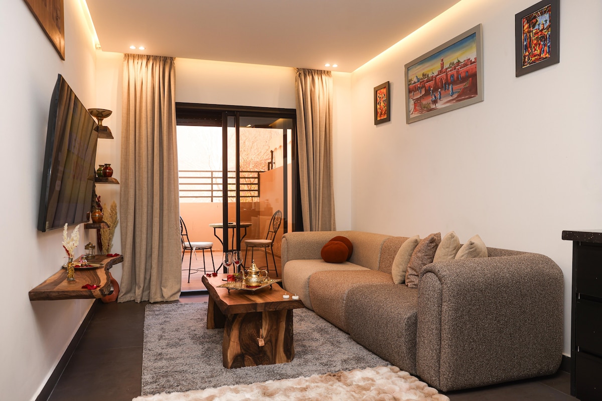Descubre un apartamento moderno y confortable. - A 3 min de la estación, a 5 min de Gueliz y a 10 min del aeropuerto. - Salón luminoso: TV 65'', Netflix, aire acondicionado - Sala de cine: proyector para noches de cine - Habitación gaming: PS4, TV, ambiente divertido - Suite principal: cama de diseño, aire acondicionado, baño privado - 2 baños: comodidad para todos - Cocina equipada: todo lo necesario - Balcón: perfecto para relajarse - Aparcamiento gratuito y seguro