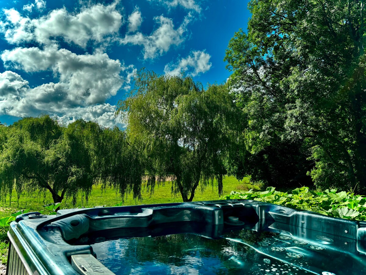 Bienvenidos a esta antigua granja reformada con toda la modernidad de nuestro tiempo. Regálese una estancia única en un entorno natural y tranquilo, ideal para reponer energías con unas vistas maravillosas del bosque y el estanque. Nuestra casa es el lugar perfecto para unas vacaciones relajantes donde podrá disfrutar de la zona de relajación con jacuzzi, el bosque privado de una hectárea y una terraza privada. No se sorprenda al ver a nuestros amigos del bosque...