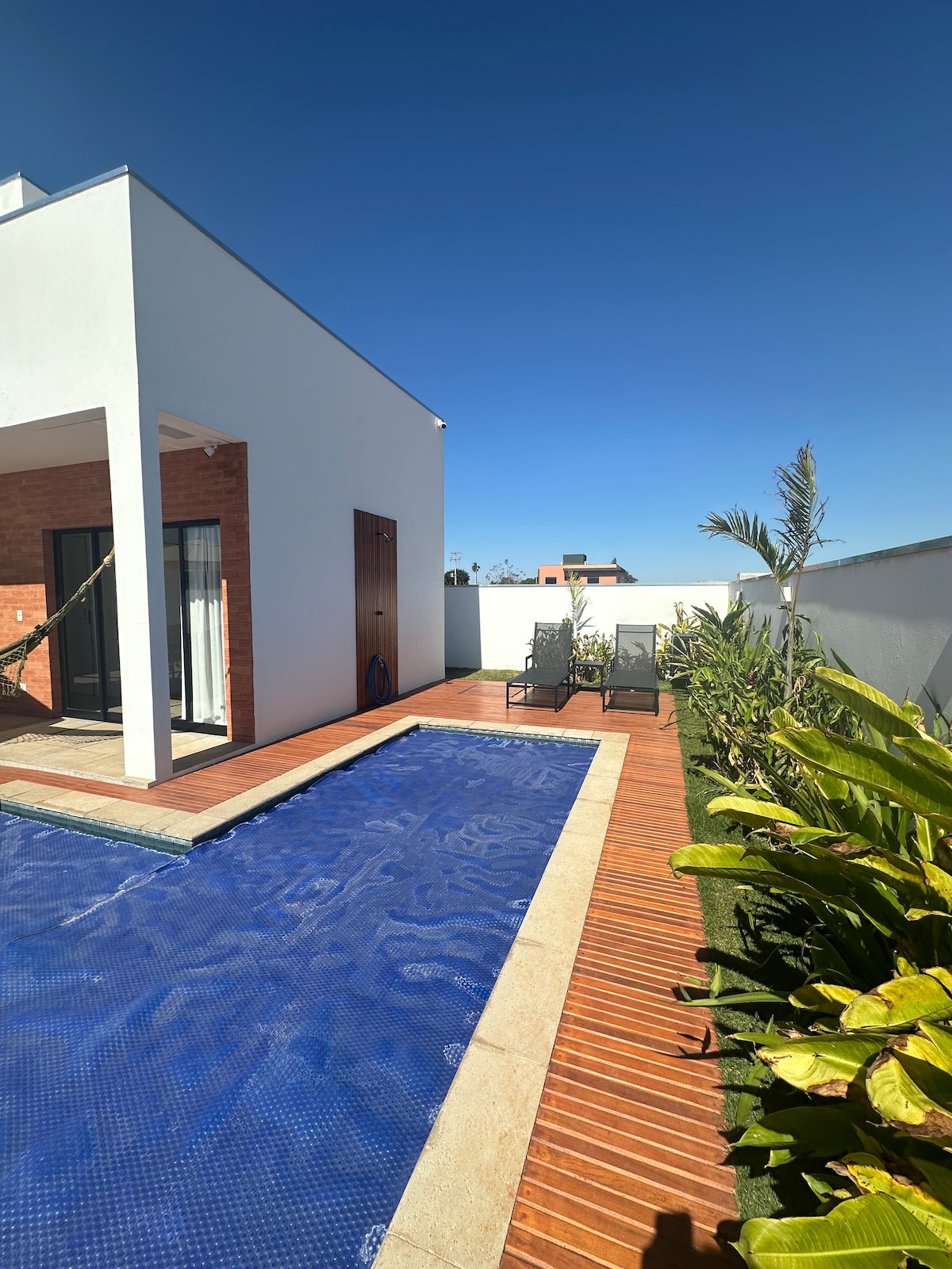 Una casa de diseño con piscina climatizada, bañera de hidromasaje climatizada, pista de tenis de playa y excelente servicio de cocina y limpieza (por separado). Hay 8000 metros de zona verde con exclusividad en un condominio abierto con seguridad y vigilancia las 24 horas. Hay cinco dormitorios (cuatro suites), aire acondicionado frío y calor en todas las habitaciones y una chimenea interior y exterior; un juego completo de ropa de cama (hotel line); una barbacoa de gas y parrilla. Starlink Internet. Distancia desde SP: 2:45 horas Capacidad máxima: 12 personas.