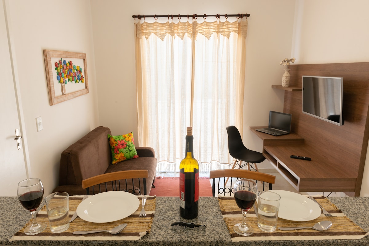 Flats com o acolhimento de estar em uma casa confortável, com cozinha equipada, roupa de cama e banho, espaço para home office, piscina, bosque com gazebo, redário, churrasqueira(sujeito à disponibilidade) e estacionamento. A categoria Flat Vista Bosque são flats no térreo ou no segundo andar com um lance de escada, dependendo da disponibilidade. Caso tenha alguma preferência, deverá informar antes de finalizar a sua reserva.