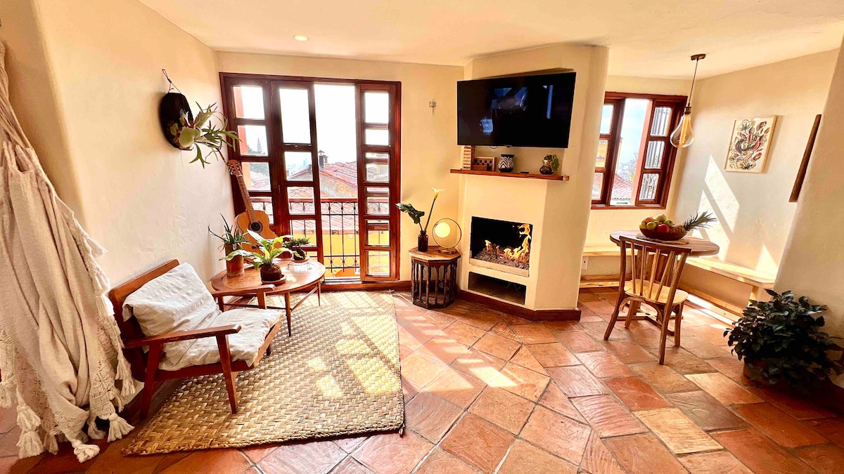 Hermoso apto en la calle mas linda del centro histórico. Romantico, autentico, acogedor, tiene mucha luz natural, temperatura agradable, hermosas vistas 360º a la ciudad y las montañas desde todos los espacios del apto. En el primer piso está la cocina abierta, sala, chimenea y balcón privado. Baño recién restaurado y habitacion con cama doble muy confortable y con ventana hacia la ciudad. Y para completar una linda experiencia, un altillo con vista al atardecer y hamaca para relajarse.