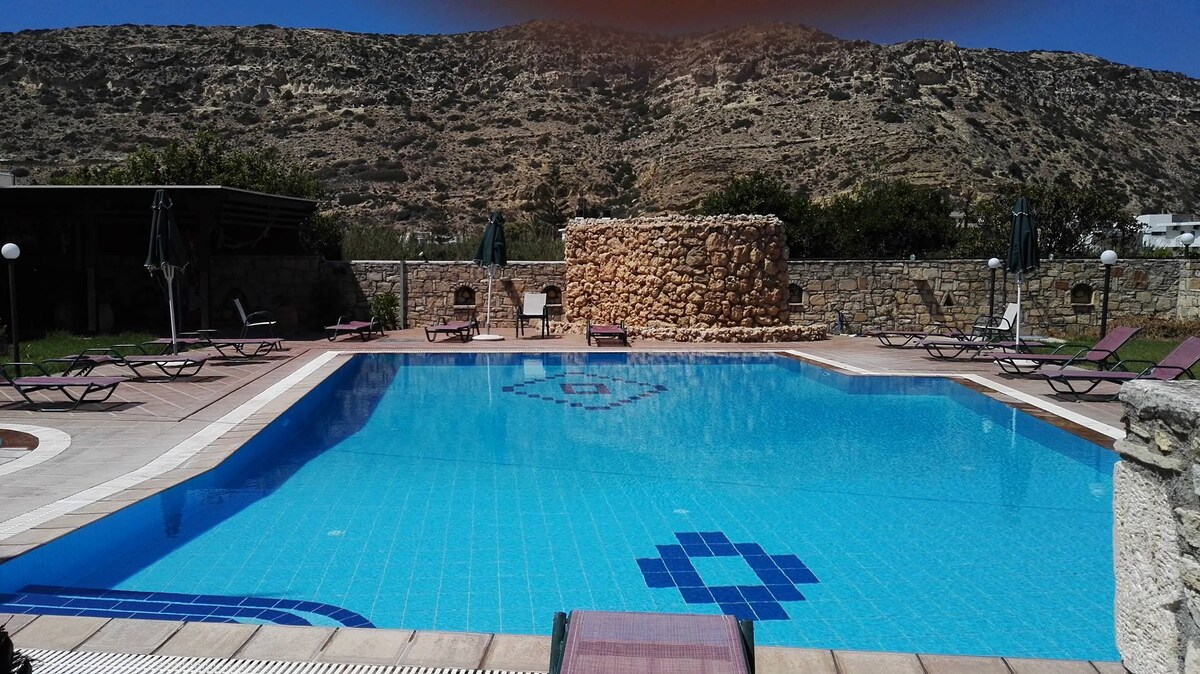 Its a nice decoreted in island style (blue and white, The blue color of the sea and the white foam of the waves ) suite (different in each room, makes them unique and gives you the sense of escape) balcony or patio that you have sea view!The complex situeted betwen two beaches :the calm beach of Lygaria and the cosmopolitan Agia Pelagia beach We are16 min about by car from Kazantzakis airport and 18 min from Heraklio port(Santorini,Pereus arrival-depart)!