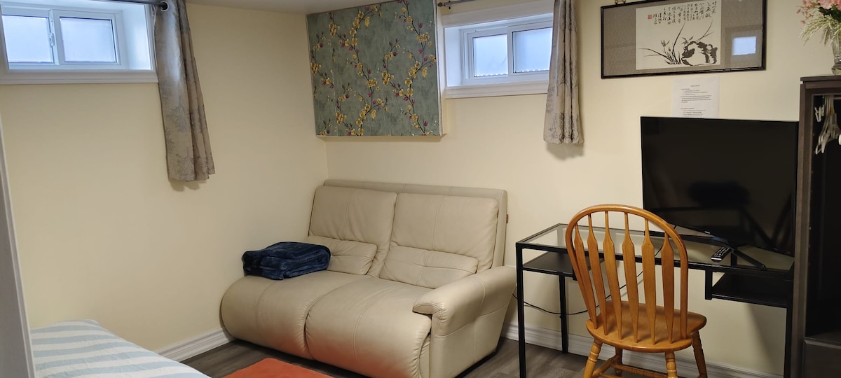 Apartamento luminoso y privado en el sótano en un barrio seguro y tranquilo en Richmond Hill. Esta unidad independiente es ideal para un máximo de 2 huéspedes y cuenta con una entrada privada, un dormitorio con una cama tamaño queen, una acogedora sala de estar con un sofá cama y una cocina completa con utensilios básicos y un refrigerador grande de doble puerta. Disfruta de Netflix, internet de alta velocidad y fácil acceso a la autopista 404, supermercados y restaurantes. El precio incluye el alojamiento para un máximo de 2 huéspedes. Sin tarifas por huéspedes adicionales