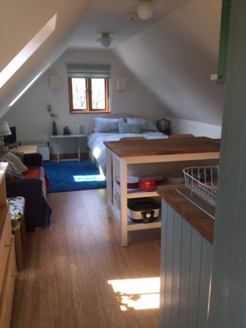 Amplio apartamento loft amueblado en el primer piso (escaleras exteriores, bastante empinadas) sobre nuestros garajes en una encantadora y tranquila localidad rural, buena zona para explorar. Adecuado para una pareja o una pareja con un niño. Cama doble, cama individual, cocina pequeña y cuarto de ducha/inodoro separado. Aparcamiento fuera de la carretera. Se aplican cargos adicionales para más de dos personas y para mascotas. Separado (50 m) de la casa principal y, por lo tanto, ofrece una gran privacidad. Algún acceso al jardín.