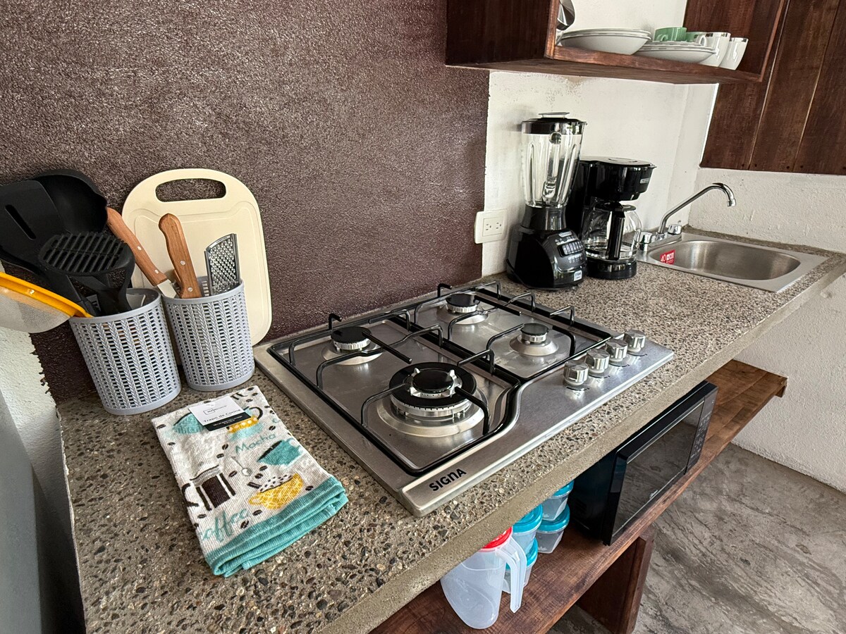 Estudio romántico con vistas panorámicas del mar en el tranquilo lado norte de Sayulita * ¡Nuevo, terminado en diciembre de 2022! *Wifi de alta velocidad *Smart TV *Aire acondicionado y ventiladores *Cocina: estufa, horno, microondas, licuadora, cafetera, todos los utensilios * Vistas panorámicas de la bahía *Cama Queen, colchón pillow top *Estacionamiento para 1 vehículo *Tina de bano *1 minuto en coche a la playa *Alberca comun y asador