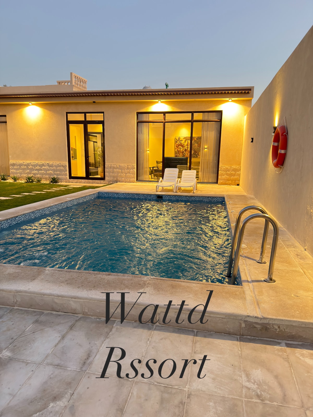 شاليه خاص ( بيت عطلات) +جناح فاخر (دور) شامل غرفة النوم ودورات المياه وغرفة الجلوس مع التلفاز وخدمة الانترنت وكرسي المساج + مع اطلاله على المسبح مع غرفة جلوس والحديقة ومجلس للضيافه وبيت شعر للإسترخاء والإستجمام وشلال صناعي بمساحة تقدر ب ٣٦٠ م وموقف خاص للسيارة Royal Suite A private suite that includes a private pool, a private car parking , in addition to two sitting rooms with tv and internet, and massage chair and two toilets And outdoor garden for relaxing with Artificial waterfall