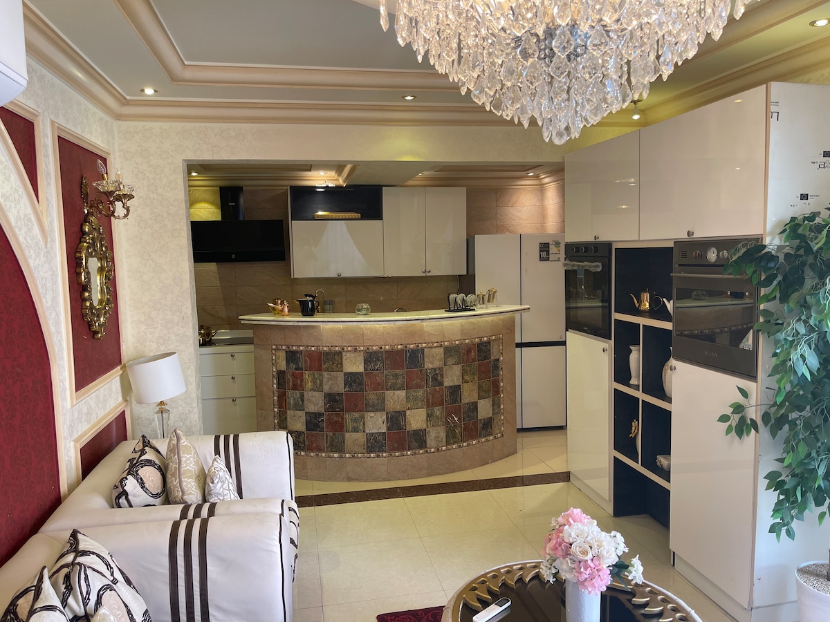 Apartamento con salón 8*8 que contiene una pantalla Samsung 85 además de Netflix + Shahid Net + Wi-Fi 5G + rincón de café integrado + cocina con todos sus requisitos + dormitorio principal 4*8 integrado + estacionamiento privado para el apartamento en el sótano y estacionamiento externo.