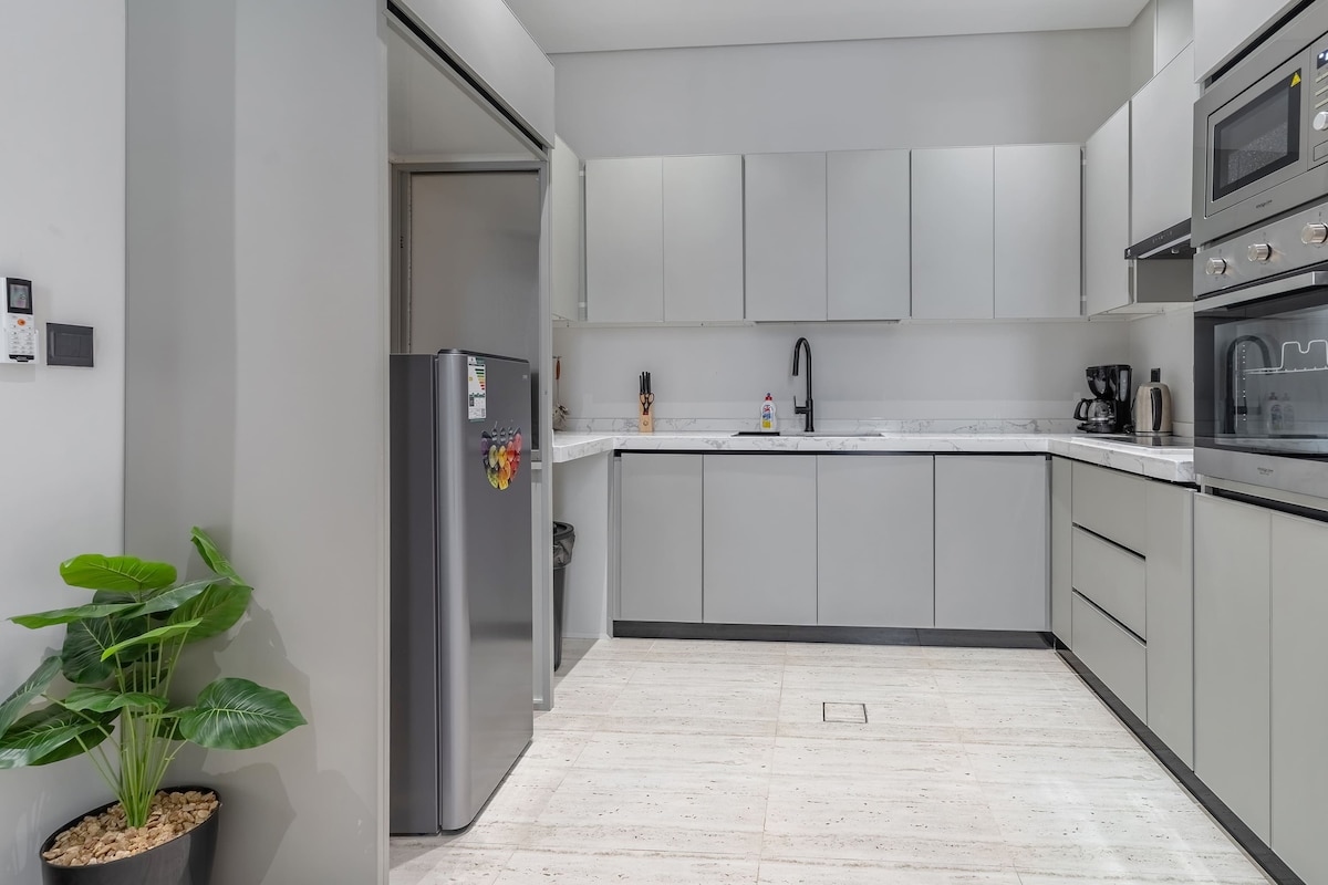 Moderno y elegante apartamento de 1 dormitorio en Al Malqa, a solo 10 minutos de Boulevard Riyadh City, Boulevard World & Kingdom Arena y a 8 minutos de Solitaire Mall. Disfruta de la comodidad de un hotel con una acogedora sala de estar, cafetera Nespresso, cocina completa, televisor inteligente, cama tamaño king, cuna, cama plegable y llegada autónoma. Aperitivos y bebidas gratuitos, wifi rápido, aire acondicionado, aparcamiento privado y fácil acceso a la cercana parada de autobús que conecta con el metro de Riad