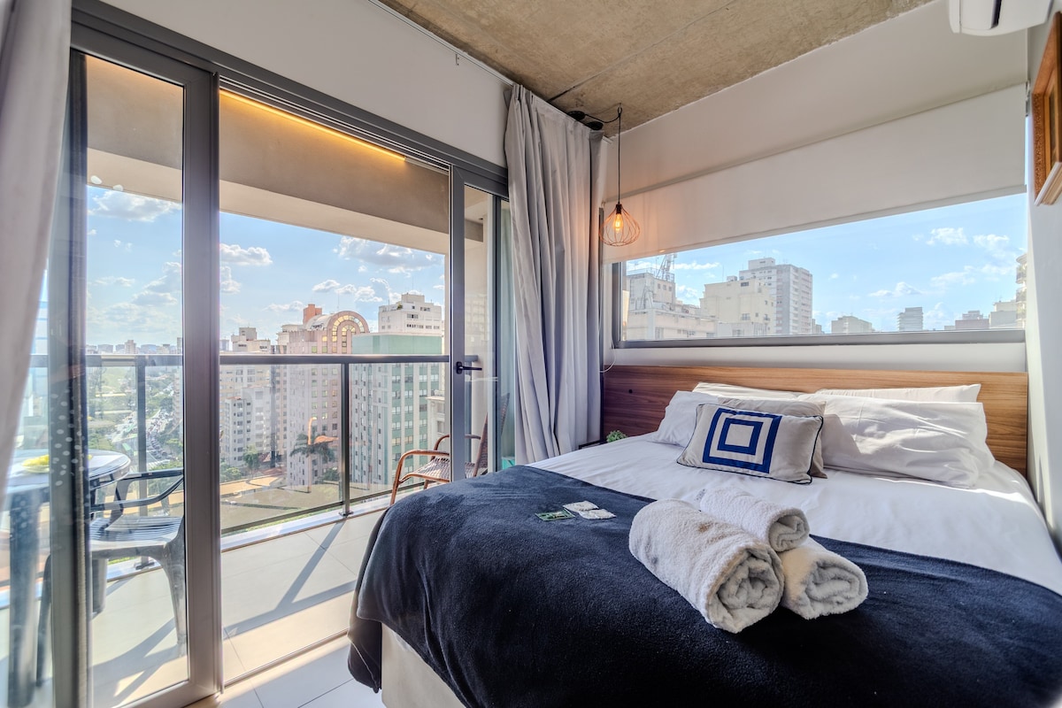 A 300 del metro V. Madalena, cerca de restaurantes, tiendas, bares y espacios culturales. Cama doble súper cómoda, aire acondicionado, internet, SmarTV 42", gran mesa de trabajo, mesa de comedor, decoración elegante, ventanas retráctiles con mucha luz natural y vistas a la ciudad. La cocina compacta cuenta con mininevera, cocina eléctrica de dos hornillas, filtro de agua, sandwichera y licuadora y utensilios de vajilla. Piscina climatizada, gimnasio, lavandería y minimercado.