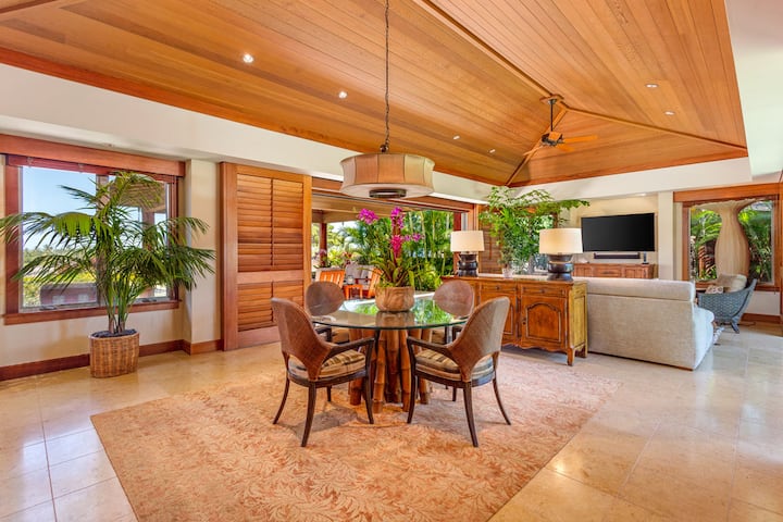 • Decoración tropical en todas partes con puertas correderas de suelo a techo que se abren al lanai y al patio de entrada