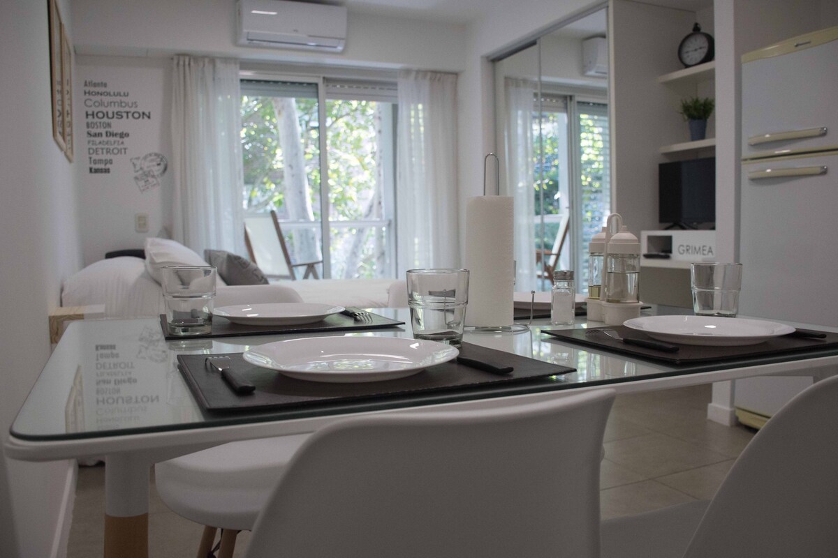 Despertá en pleno casco histórico, a pasos del Monumento a la Bandera y del río Paraná. Este moderno y luminoso departamento ofrece la combinación ideal entre ubicación, comodidad y tranquilidad para disfrutar Rosario como un local. Con 33 m² cuidadosamente diseñados, es perfecto para viajes de descanso, trabajo o escapadas en pareja. El espacio cuenta con aire acondicionado frío/calor, Smart TV y WiFi rápido, todo preparado para que tu estadía sea cómoda desde el primer momento.
