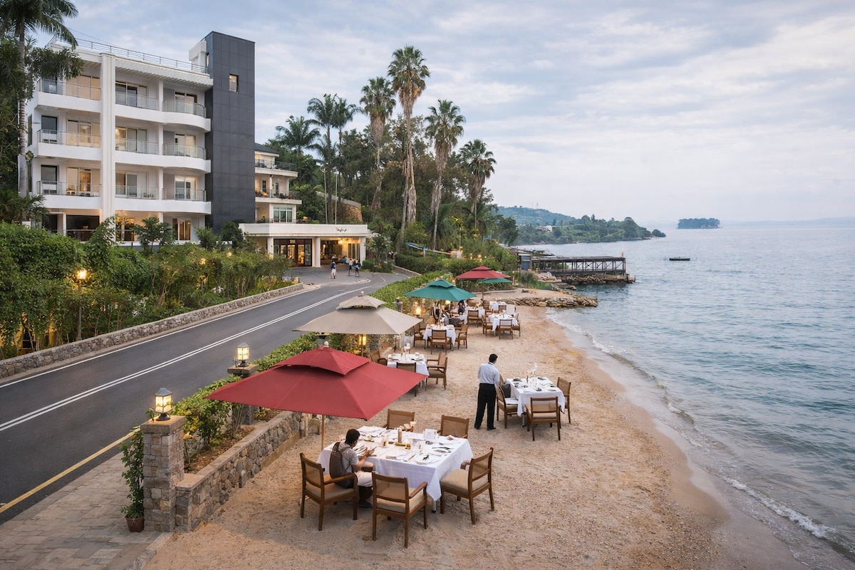 Murugo Bay es un refugio frente al lago Kivu, un lugar donde el diseño, la naturaleza y la tranquilidad se dan la mano. Ubicadas en jardines paisajísticos, tres bandas de paja hechas a mano están unidas por pasarelas con dosel, creando un flujo perfecto entre la comodidad interior y la serenidad exterior. Los huéspedes pueden disfrutar de una fogata, una playa privada con kayaks, servicios para familias y vistas panorámicas del lago Kivu.