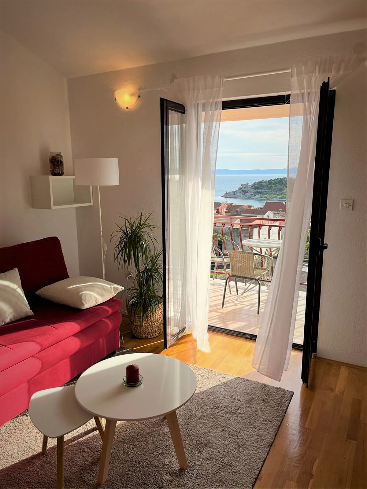 The apartment is for 2 persons , 50m2, on the third floor, the central door. On the left is the separated room with inside door with the french bed, bathroom, airconditioning, wifi, balcony - seaside. On the right is the large separated room with inside door where is the sofa , bathroom, big kitchen with eating place, loundry machine, airconditioning, sat tv, wifi, the large terrace with the perfect view to the sea, parking place .
