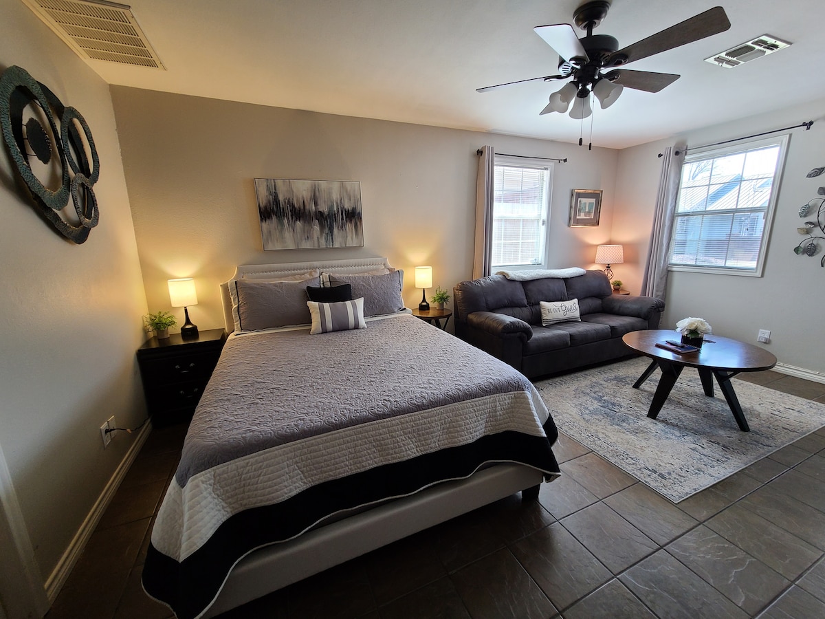Bienvenido a una cómoda casa de huéspedes que está a solo unas millas de la I-44, los hospitales regionales de United Regional y Kell West, Sheppard AFB y el centro de Wichita Falls y MPEC. La casa de huéspedes tiene capacidad para 4 personas: cama tamaño queen (con colchón de espuma viscoelástica) y un sofá cama que se convierte en una o dos camas individuales (una es una cama nido), ambos con colchones de espuma viscoelástica. Las mascotas son bienvenidas, pero deben estar entrenadas en la casa y mantenerse en silencio, y hay una pequeña tarifa por mascotas.