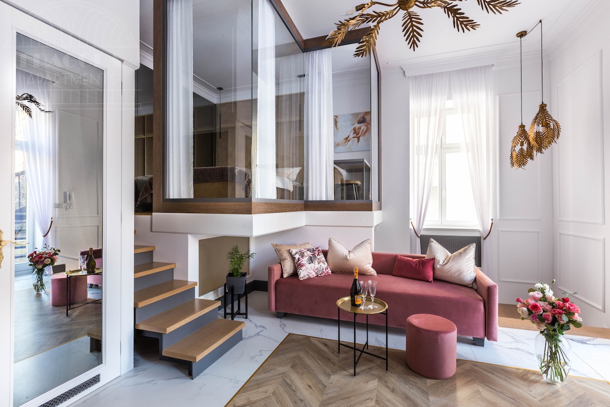 Luxury 3-room apartment with an area of 97 m², located in a beautifully restored late 19th–early 20th century building, impressing with its architecture and attention to detail. Across nearly 100 m², guests have access to a living room combined with a dining area and a semi-open, fully equipped kitchen, two comfortable bedrooms each with its own bathroom, a spacious hallway, an additional toilet, and a balcony.