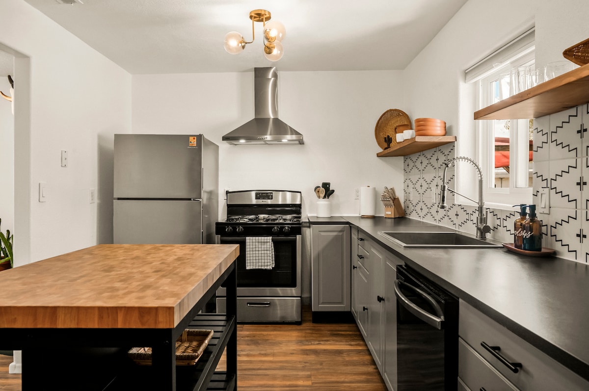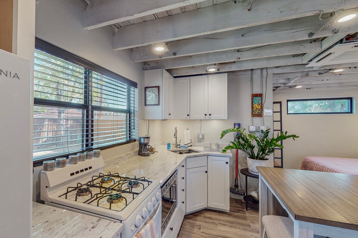 Esta moderna casita de estilo suroeste se encuentra cómodamente en nuestra histórica propiedad de adobe de 1923 que combina materiales antiguos y comodidades modernas. Construida por un artista, aporta un toque moderno a tu aventura en Albuquerque. Casita significa casita en español, y esta casita es completamente una casa. Cuenta con cocina completa, cama tamaño king, ducha de cascada, patio privado y puertas de entrada que fusionan el hermoso exterior de NM con nuestro acogedor interior. Permiso: 052140