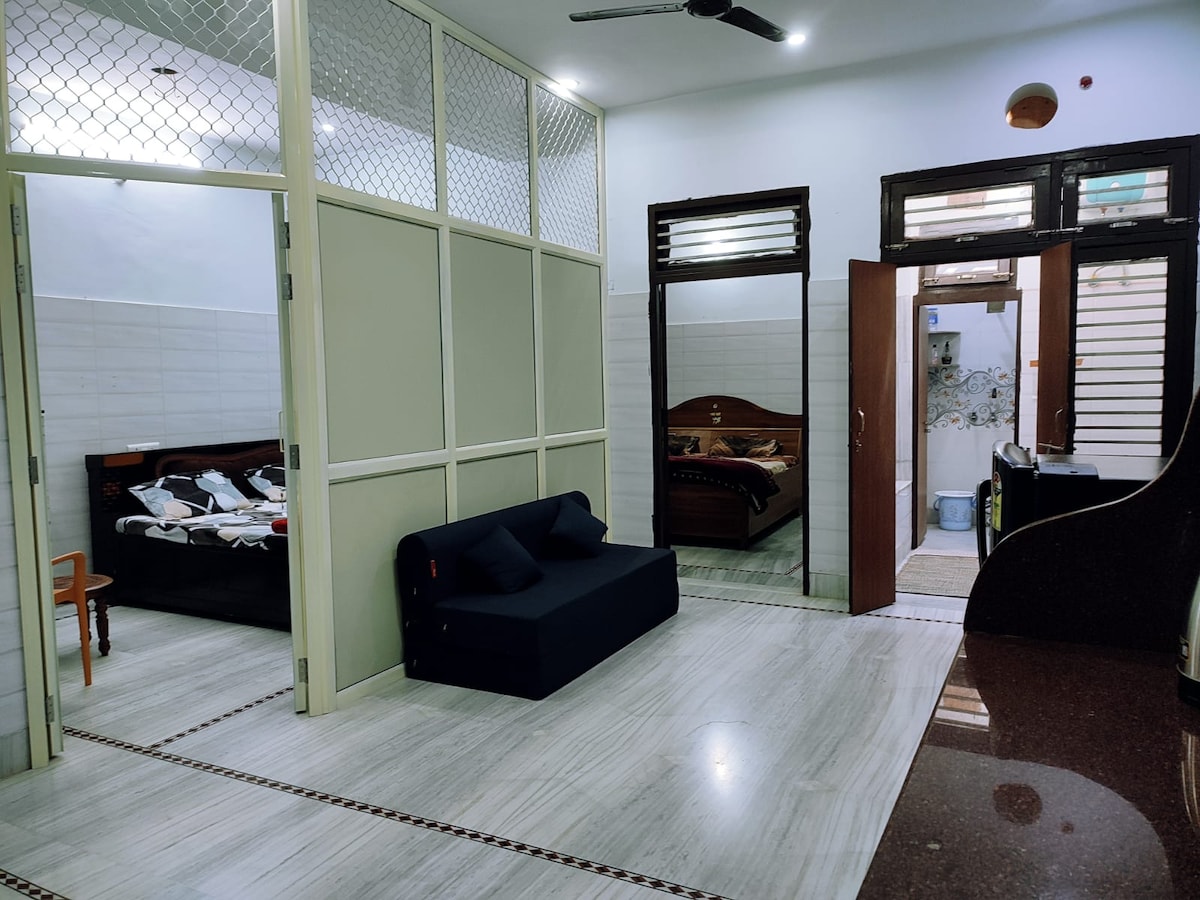 Welcome to our modern yet heritage-inspired villa featuring 2 comfortable beds, a private kitchen, and a private bathroom. Conveniently located just a 2-minute walk from Agra Airport, and close to major attractions like the Taj Mahal, Agra Fort, and others (approx. 5 km / 20 mins). Our space is perfect for tourists, business travelers, seniors, families, and even pets. We’re happy to assist with taxi arrangements, homemade meals, and other needs to make your stay smooth and enjoyable.