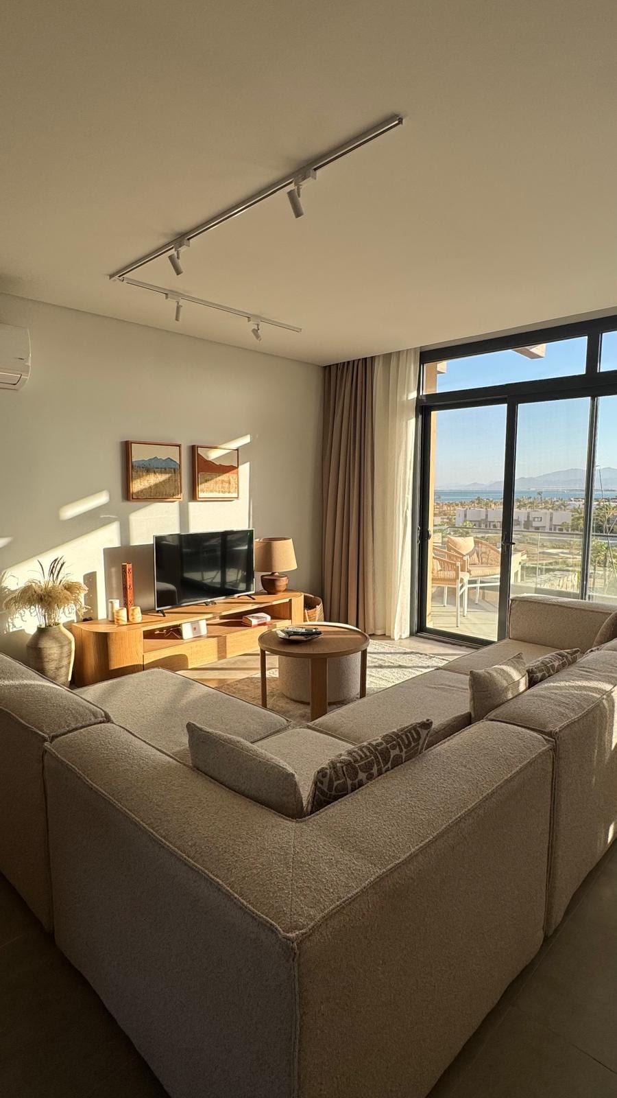 Apartamento moderno de estilo europeo con vistas al mar y a las montañas Todos los muebles están hechos a mano localmente. En la espaciosa terraza, puedes relajarte en las tumbonas y disfrutar de la vista panorámica del mar. El gran dormitorio con fantásticas vistas a las majestuosas montañas del desierto de Safaga ofrece mucho espacio y tranquilidad. La cocina está equipada con electrodomésticos de alta calidad. La amplia sala de estar con un sofá cama extraíble también ofrece vistas al mar.