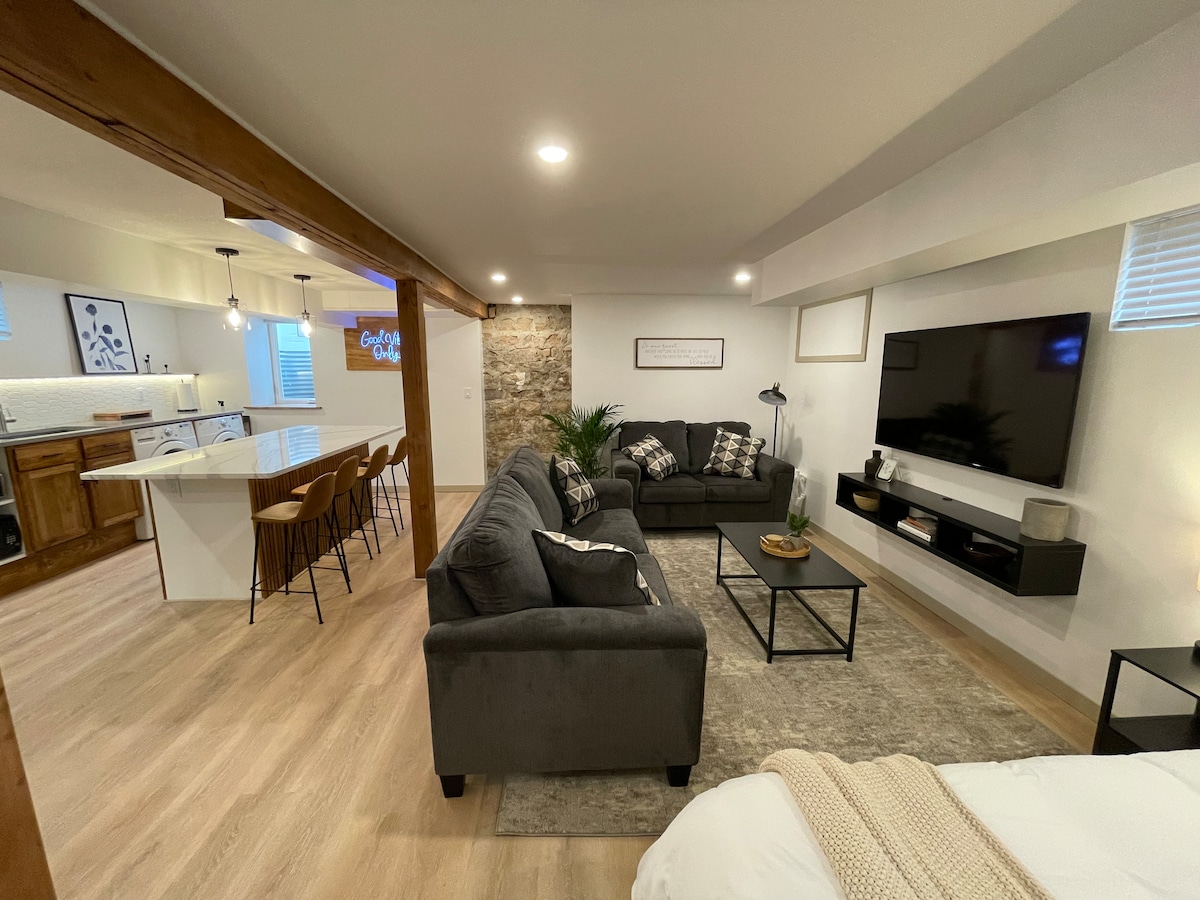Apartamento de lujo de 1400 pies cuadrados. Todos los electrodomésticos, incluida la lavadora y la secadora. Internet de alta velocidad y TV por cable. Cerca de hoteles, tiendas de comestibles y la cervecería Schells a poca distancia a pie. Carril bici pavimentado al otro lado de la calle. La suite es perfecta para personas trabajadoras que vienen a New Ulm y necesitan un alojamiento muy cómodo para estancias cortas o largas. También es ideal para una escapada de fin de semana. A veces somos flexibles con el número de huéspedes. Si son más de 3, se requiere aprobación previa. La segunda cama es un futón en una habitación pequeña.