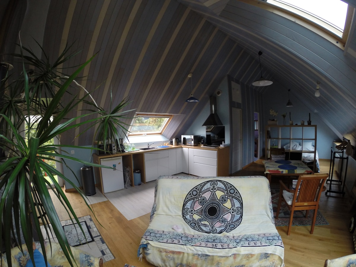 Apartamento muy luminoso en el centro de la ciudad de Guingamp. Las tiendas, las tiendas de comestibles, el cine, la piscina, el teatro, el paseo del Trieux están a poca distancia. Nuestro alojamiento incluye una sala de estar con cocina americana (vajilla, microondas, cafetera, hervidor de agua...), televisión, sofá. una pequeña habitación con armario alto y un baño con ducha Hay gratis Wifi. La cama estará hecha a la llegada y 2 toallas por viajero. Entrada autónoma con caja de llaves.
