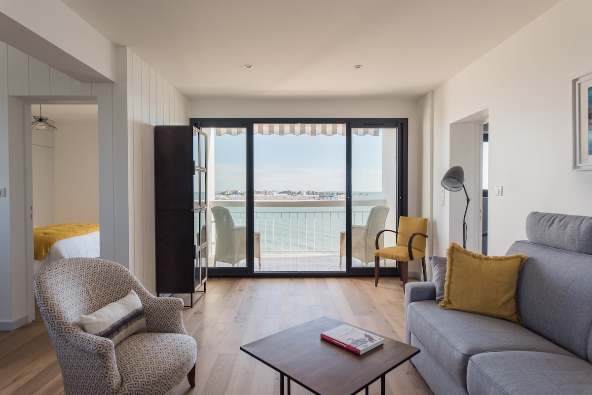 A noter: Résidence avec travaux de ravalement en cours (2026), merci de consulter les détails sur 'Logement' Bénéficiez d'un emplacement privilégié avec une vue panoramique sur La Rochelle, le port des minimes, l’océan. La résidence dispose d'un jardin privé face à la mer et d'un accès à une petite plage. Ce bel appartement, disposant de deux chambres en vue de mer, vient d’être intégralement rénové et décoré avec soin. Entièrement équipé à neuf, il vous offre des prestations de qualité.