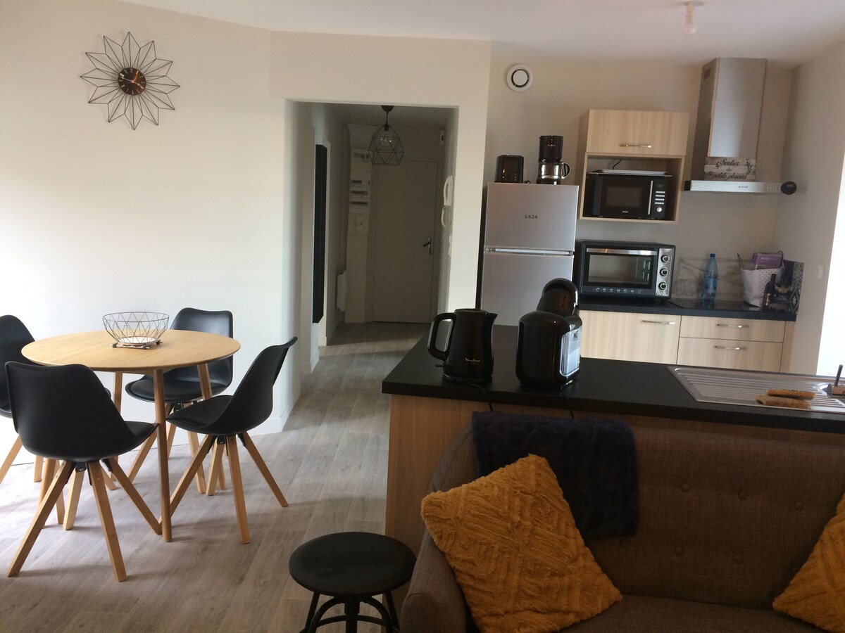 Acogedor apartamento de 46 m² con terraza sur amueblada y arbolada en la planta baja (32 m²) en una residencia reciente y tranquila. Bien climatizado en invierno. Aparcamiento gratuito A 5 minutos a pie de la estación de tren cerca de todos los comercios, a 15 minutos a pie de la ciudad histórica y las playas Se proporciona ropa de cama a petición: 10 € por cama para la estancia Se proporcionan toallas de forma gratuita. Un segundo inodoro independiente del baño Wifi gratuito Nbrx restaurantes cercanos cocinan en fórmula para llevar. Posibilidad de teletrabajo