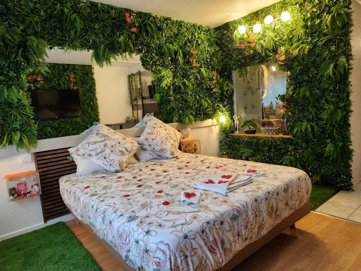 Un studio intime, sensuel et végétalisé 🌷 🌿Offrez-vous une escapade romantique inoubliable dans ce studio cocooning et végétal. 🌷Plongez dans une ambiance apaisante, où les murs sont habillés de verdure où chaque détail à été soigneusement pensé pour éveiller vos sens. 🛏️ Une literie confortable décorée de pétales de rose 🚿 Une douche avec vue sur la chambre ❤️ Des extras payant romantiques disponibles : petit déjeuner, pétales, jeux coquins.. ✨ Réservez votre moment dès maintenant. ✨