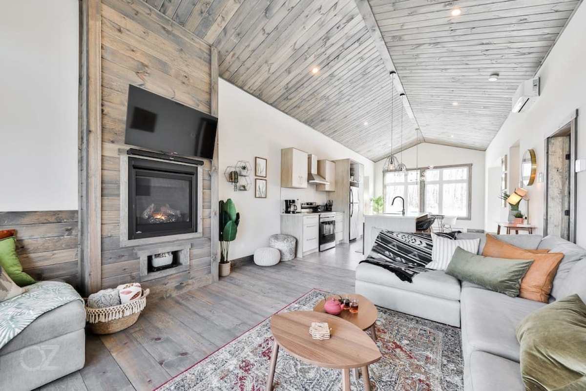 Nuestro chalet en el bosque nórdico es perfecto para pasar tiempo de calidad en pareja (o con un niño) o para un tratamiento de trabajo (con wifi de alta velocidad). El interior de madera es cálido y acogedor. Las ventanas de altura completa ofrecen unas vistas impresionantes sobre un valle boscoso. La cocina y la sala de estar de concepto abierto te mantienen en la conversación mientras cocinas. Si prefieres cocinar afuera, hay un fogón con parrilla y mesa de comedor al aire libre. A solo 70 minutos en coche de Montreal. El lago está a 25 minutos a pie si aparcas cerca.