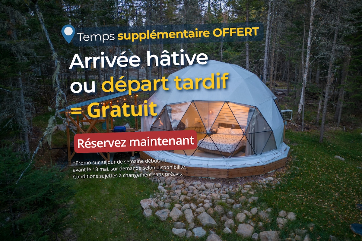 *Expérience sans eau ni électricité* Voici un hébergement de glamping unique située à St-Mathieu-du-Parc. Ce dôme confortable dispose d'un lit queen-size (literie incluse) qui fait face à une grande ''bay window'' avec une vue imprenable sur la belle nature qui l'entoure. Un foyer au bois pour vous réchauffer sera là pour vous accueillir après une journée complète passée à profiter du plein air. Cet espace est unique - et hors réseau/off grid.