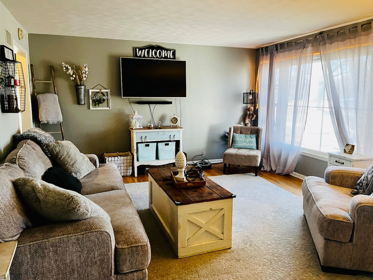 ¡Alojamiento tranquilo en el campo justo al lado de la I-70 con un parque infantil y sin tarifa por mascotas! Te damos la bienvenida a nuestra casa de huéspedes rehabilitada de 1906 con comodidades modernas en una granja de 10 acres. Cama doble, cama doble, sofá, futón en loft. Nuevo baño de azulejos con ducha y varita de lluvia, cocina pequeña, estación de café, registro, reproductor de CD y casete, juegos, packnplay, plancha y tabla, televisor inteligente, cubierta trasera, pez dorado en tanque para alimentar, caballos y ganado, y gatos de granja. LAS MASCOTAS DEBEN SER KENNELED CUANDO NO ESTÉN PRESENTES
